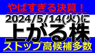 2024/5/14(火)に株価が上がる株、株式投資・デイトレの参考に。やばすぎる決算!ストップ高候補多数!