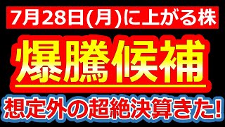 【超絶好決算!!あの企業が超サプライズで市場騒然!】7/28(月)に株価が上がる株・明日上がる株・来週上がる株・株式投資日本株最新情報
