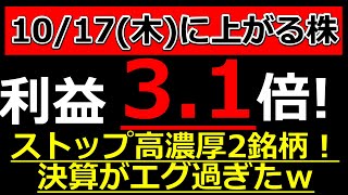 ストップ高濃厚2銘柄!決算がエグ過ぎたw利益3.1倍【10/17(木)に株価が上がる株・明日上がる株・株式投資日本株最新情報】