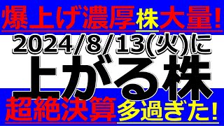 2024/8/13(火)に株価が上がる株、株式投資・デイトレの参考に。爆上げ濃厚株大量の予感!超絶決算が多過ぎて取り上げきれない件!