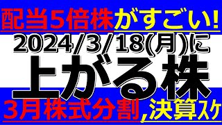 配当5倍株がすごい!2024/3/18(月)に株価が上がる株、決算スケジュール、3月の株式分割注目株、日本株の最新情報、株式投資・デイトレの参考に。明日上がる株、増配、株式分割、自社株買い、
