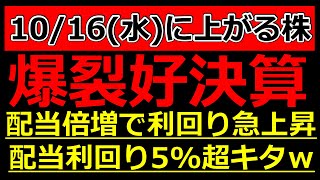 【10/16(水)に株価が上がる株・明日上がる株・株式投資日本株最新情報】爆裂好決算!配当倍増で利回り急上昇!配当利回り5%超キタw