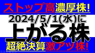 2024/5/1(水)に株価が上がる株、株式投資・デイトレの参考に。ストップ高濃厚株!超絶決算激アツ株!