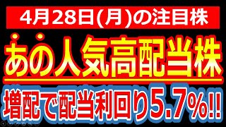 【株主安堵!あの超人気高配当株が決算無事通過!しかも増配発表で配当利回りが5.7%へ上昇!】4/28(月)に株価が上がる株・来週上がる株・明日上がる株・株式投資日本株最新情報