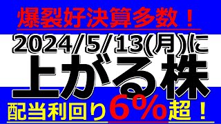2024/5/13(月)に株価が上がる株、株式投資・デイトレの参考に。爆裂好決算多数!配当利回り6%超!