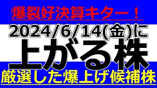 2024/6/14(金)に株価が上がる株、株式投資・デイトレの参考に。爆裂好決算キター!厳選した爆上げ候補株!