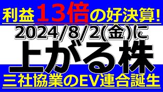 2024/8/2(金)に株価が上がる株、株式投資・デイトレの参考に。利益13倍の好決算!三社協業のEV連合誕生!