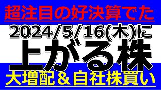 2024/5/16(木)に株価が上がる株、株式投資・デイトレの参考に。超注目の好決算でた!大増配&自社株買い!
