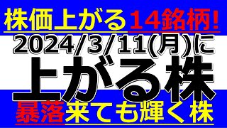 2024/3/11(月) 株価が上がる14銘柄、決算スケジュール、3月の株式分割注目株、明日株価が上がる株、ストップ高候補株、増配株、株式分割、自社株買いなど。株式投資・デイトレの参考に。