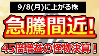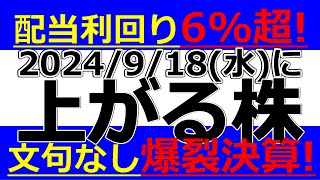 2024/9/18(水)に株価が上がる株、株式投資・デイトレの参考に。配当利回り6%超!文句なし爆裂決算!