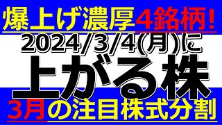 2024/3/4(月) 爆上げ濃厚4銘柄、決算スケジュール、3月の株式分割注目株、株式投資・デイトレの参考に。