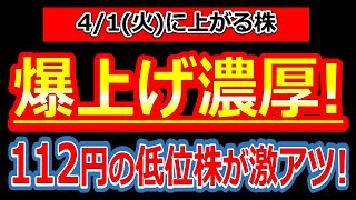 【たった112円の低位株が超絶決算発表で株価+30%超濃厚か!?地合い悪化の今こそ低位株が熱い!】4/1(火)に株価が上がる株・来週上がる株・明日上がる株・株式投資日本株最新情報