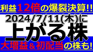2024/7/11(木)に株価が上がる株、株式投資・デイトレの参考に。利益12倍の爆裂決算!!大増益&初配当の株も!