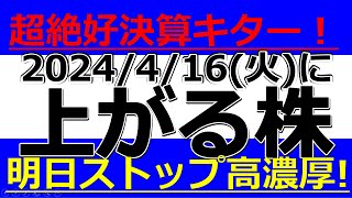 2024/4/16(火)に株価が上がる株、株式投資・デイトレの参考に。超絶好決算キター!明日ストップ高濃厚な株!