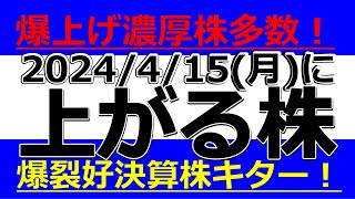 2024/4/15(月)に株価が上がる株、株式投資・デイトレの参考に。爆上げ濃厚株多数!爆裂好決算株キター!