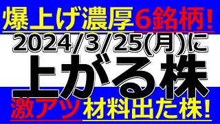 2024/3/25(月) 爆上げ濃厚6銘柄!激アツ材料出た株!株式投資・デイトレの参考に。3月、4月の株式分割まとめ、決算スケジュールほか