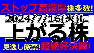2024/7/16(火)に株価が上がる株、株式投資・デイトレの参考に。ストップ高濃厚株多数!見逃し厳禁!超絶好決算!