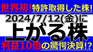 2024/7/12(金)に株価が上がる株、株式投資・デイトレの参考に。世界初!特許取得した株!利益10倍の驚愕決算!?