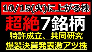【10/15(火)に株価が上がる株・明日上がる株・株式投資日本株最新情報】超絶材料出した厳選7銘柄!特許成立、共同研究、爆裂決算など