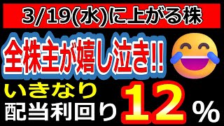 【オメデトウ!全株主が嬉し泣き!いきなり配当利回り12%になった株がスゴイ!】3/19(水)に株価が上がる株/明日上がる株/バーゲン株/明日から使える株式投資日本株最新情報