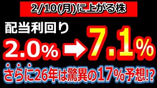 【これは夢か!?配当利回りが2.0%から7.1%へ超絶大増配!!さらに2026年は驚異の17%予想!?】2/10(月)に株価が上がる株・明日上がる株・株式投資日本株最新情報