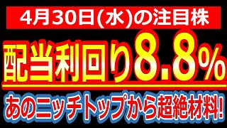 【エグイ大増配!!配当利回りは驚異の8.8%!!】あのニッチトップから超絶材料でた!4/30(水)に株価が上がる株・来週上がる株・明日上がる株・株式投資日本株最新情報