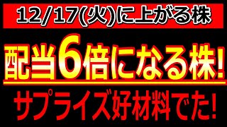 配当6倍になる株!サプライズ好材料でた!【12/17(火)に株価が上がる株・明日上がる株・株式投資日本株最新情報】