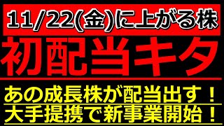 初配当キタ!あの成長株が配当出す!大手提携で新事業開始する株も【11/22(金)に株価が上がる株・明日上がる株・株式投資日本株最新情報】