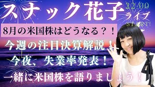 スナック花子今夜22時から!8月の米国株はどうなる?!今週の注目決算解説!今夜、失業率発表!一緒に米国株を語りましょう!