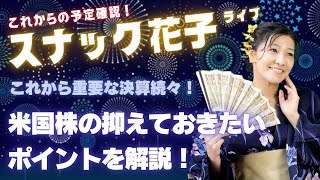 スナック花子ライブ今夜22時から!これから重要な会社の決算が続々始まりますよ〜!スケジュールを確認して、米国株の抑えておきたいポイントを解説!みんな、遊びに来てね!!!