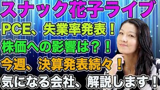 スナック花子ライブ今夜22時から!PCE,失業率発表!株価への影響は?!今週、決算発表続々!気になる会社、解説します!みんな、遊びに来てね!