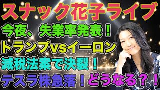 スナック花子ライブ今夜22時から!今夜失業率発表!株価はどう動く?トランプvsイーロンマスク減税法案で決裂!テスラ株が急落!これからどうなる?!今日も話題盛りだくさん!皆さん、一緒にお話ししましょう〜
