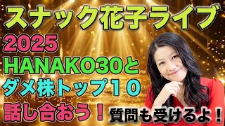 スナック花子ライブ今夜23時から!2025年HANAKO30とダメ株トップ10話しあおう〜!質問も受け付けますよ!花子と一緒に2025年の投資戦略を話し合おう〜!!