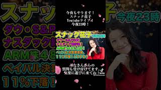 スナック花子今夜23時!今夜も話題盛りだくさん!ダウ・S&P500・ナスダック絶好調!ARM株48%上昇!ペイパル決算発表後に11%下落!どうする?遊びに来てね!