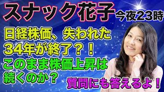 スナック花子ライブ今夜23時!日経株価、失われた34年が終了?!このまま株価上昇は続くのか?皆さんの質問にも答えます!金曜日の夜は花子と一緒に熱い株ナイト、、、