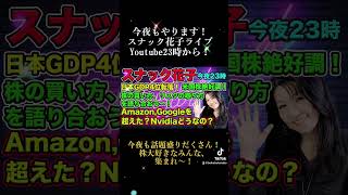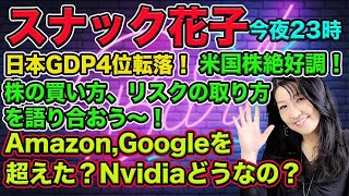 スナック花子ライブ今夜23時!日本GDP世界4位へ転落!米国株絶好調!株の買い方、リスクの取り方を語り合おう〜!Amazon、Googleを超えた?Nvidiaってどうなの?金曜日の夜を花子と共に、、