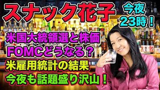 スナック花子ライブ今夜23時!アメリカ大統領選と株価、FOMCどうなる?米雇用統計の結果、今夜も話題盛りだくさん!投資初心者さん大歓迎〜!質問も受け付けます〜!