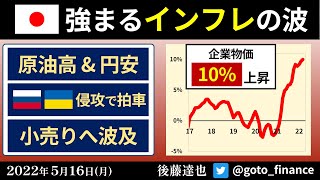 日本にもインフレ 企業物価10%上昇 小売りに波及も(2022/5/16)