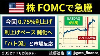 米国株、FOMCで急騰 ナスダック4%高 0.75%利上げも今後は「緩やか」(2022/7/28)