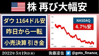 NYダウ平均1164ドル安 ナスダックも急落(2022/5/19)