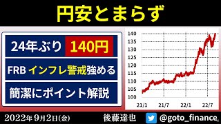 円安とまらず 24年ぶり1ドル=140円(2022/9/2)