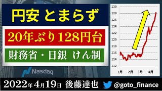 円安とまらず 20年ぶり128円 日銀・財務大臣けん制も(2022/4/19)