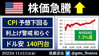 米国株急騰 NASDAQ 7%高 CPI予想下回る 利上げ警戒和らぐ ドル円140円台に