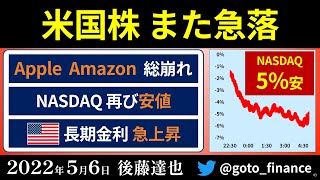 米国株また急落 NASDAQ5%安(2022/5/6) 再び安値 Apple, Amazon, Tesla総崩れ 米10年債3.1%に FOMC後の株高打ち消す