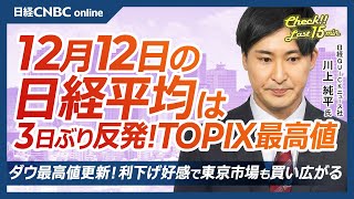 【日経平均株価は3日ぶり反発!|12月12日(金)東京株式市場】ダウ最高値更新の流れで東京市場でも買い広がる/半導体株はブロードコム決算が重しで軟調に/住友ゴは「ダンロップ」世界展開期待で連日高値更新