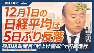 【日経平均は5日ぶり反落|12月1日(月)東京株式市場】植田総裁発言で利上げ警戒で円高進行/利上げ予想は8割まで上昇/配当金再投資は今週がピークか?/日本労働連合は2026年賃上げ5%以上目標