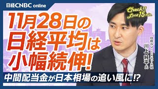 日経平均株価は続伸【11月28日(金)東京株式市場】米市場休場で方向感乏しい展開に/米12月FOMC利下げ確率85%?ハイテク株に追い風/中間配当8.9兆円再投資に期待/東証プライム売買代金は低水準に