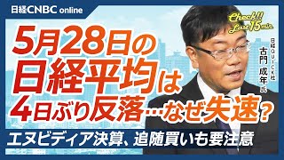 エヌビディア決算、半導体株の追随買いには注意も│NQN古門成年氏【5月28日(水)東京株式市場】日経平均株価は小幅に4日ぶり反落、引けにかけ失速/40年債入札は低調/防衛株や材料株に物色、メタプラなど