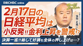 BofAが季節性に警鐘鳴らす│NQN張間正義記者【2月17日(月)東京株式市場】日経平均株価は反発、GDP上振れで金利上昇/日銀利上げ前倒しも/日本株・決算総じて好調/ナスダック100/GS集計FCI