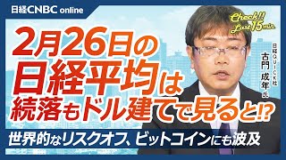 世界的なリスクオフ、ビットコインにも波及│NQN古門成年記者【2月26日(水)東京株式市場】日経平均株価は続落、ドル建てなら⇧/今晩エヌビディア決算/日本株・半導体株⇩/米景気減速で円買い、自動車株は